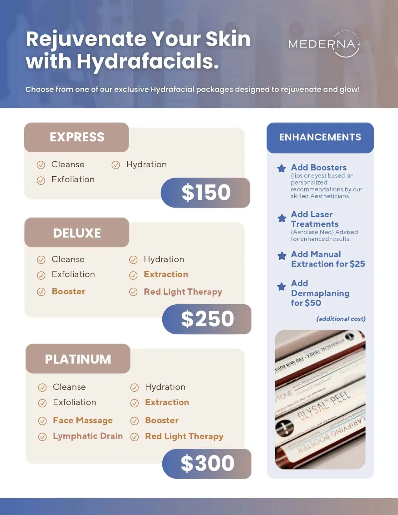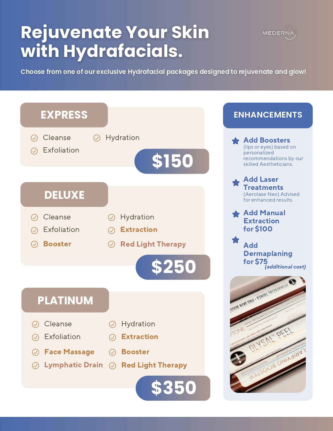 This version includes all the steps of the Express HydraFacial, with a customized booster to address specific skin concerns such as lines, wrinkles, dark spots, or acne. It may also include LED light therapy for additional skin rejuvenation benefits.
